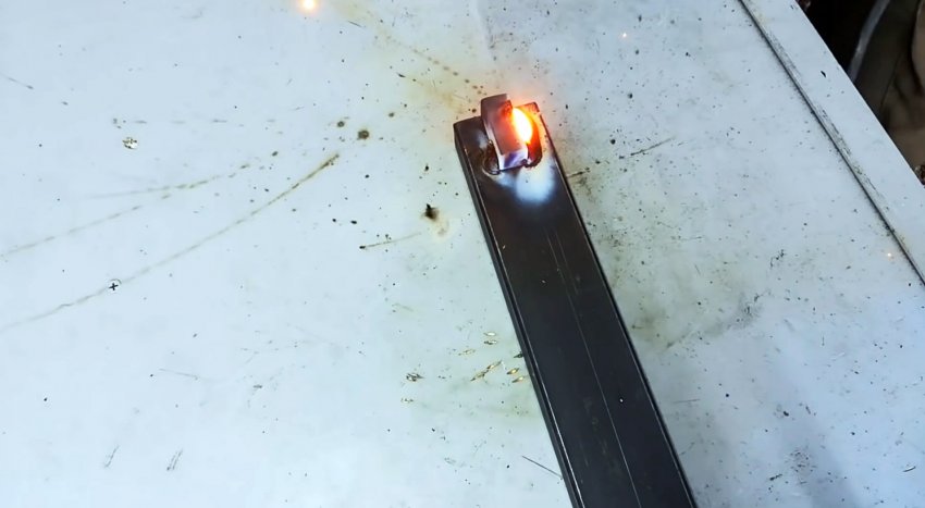 Для обеспечения зазора между уголком и трубой, а также на узкую сторону трубы помещаем полоски жести. Накрываем сверху торцы уголка, прямоугольной пластины и узкую сторону трубы пластиной со скосом.