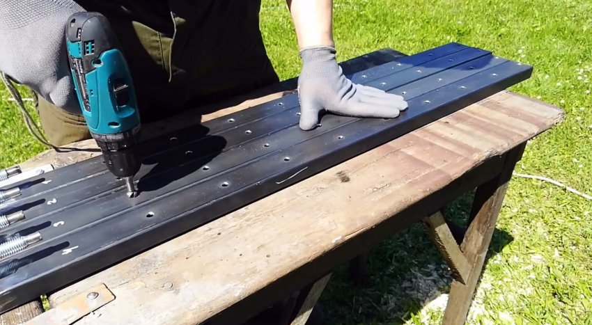 Раздвигаем упоры к концам профильных труб и по разметкам сверлим вдоль их продольных осей систему отверстий.