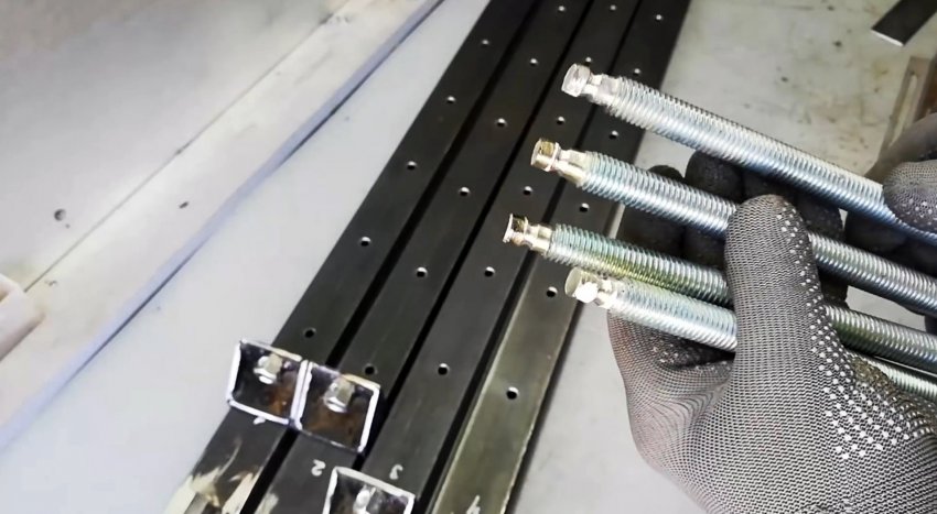 Ближе к низу соединительных гаек со вкрученными шпильками намечаем и сверлим сквозные поперечные отверстия, вставляем в них болты с квадратным подголовком и накручиваем на них гайки.