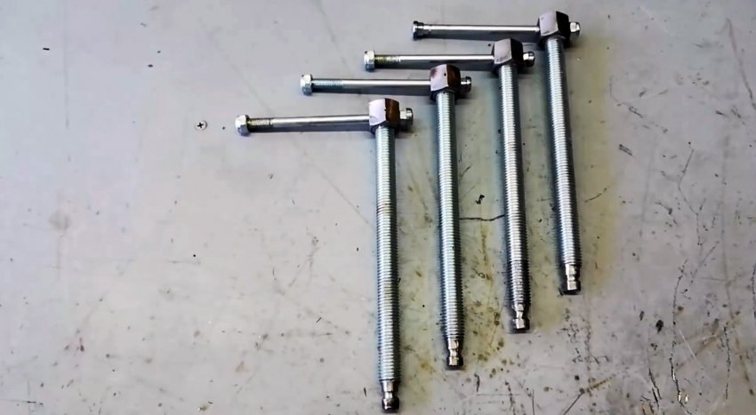 Вкручиваем короткие шпильки в соединительные гайки до конца и завариваем их. Полукруглые головки болтов с квадратным подголовком превращаем в шестигранные.