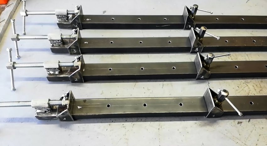 Вкручиваем стопорные болты в гайки упоров и надеваем их на трубы-направляющие. После высыхания краски набор струбцин готов к работе.