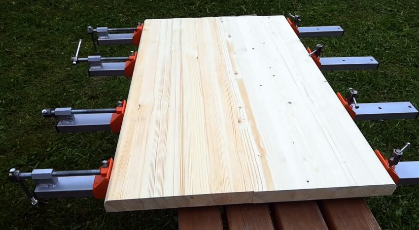 Для этого между упорами помещаем доски для склеивания. Упоры со стопорными болтами размещаем вплотную к ближайшей доске и стопорим их. Сдавливаем вторую доску упорами с помощью ходовых винтов.