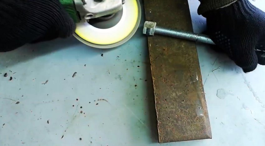 На квадратный стержень сверху продольно укладываем соединительную гайку с вкрученным в нее болтом и привариваем гайку к стержню.