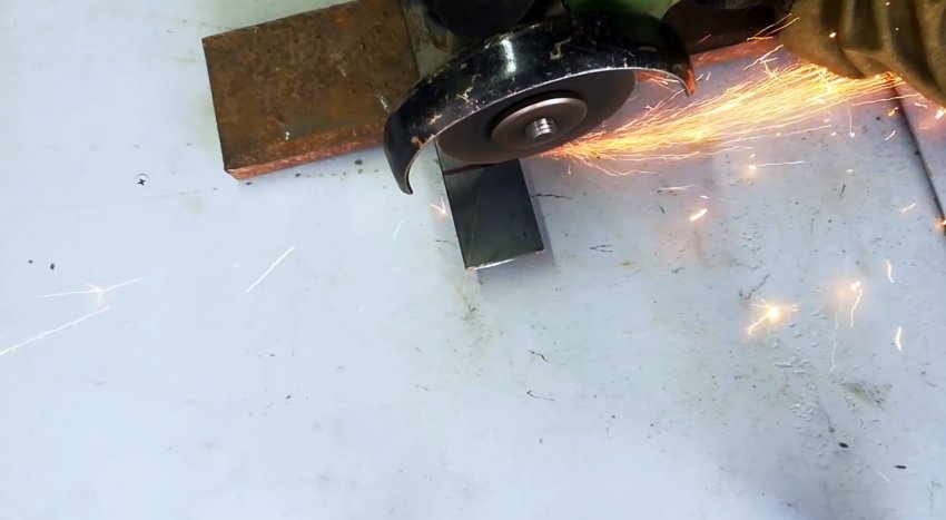 Проводим на пластине прямую линию между концами полок уголка. Болгаркой срезаем угол пластины и отделяем ее от полосы. Заготавливаем таких деталей 16 штук.