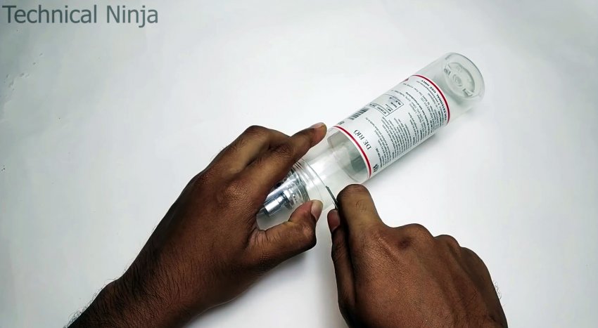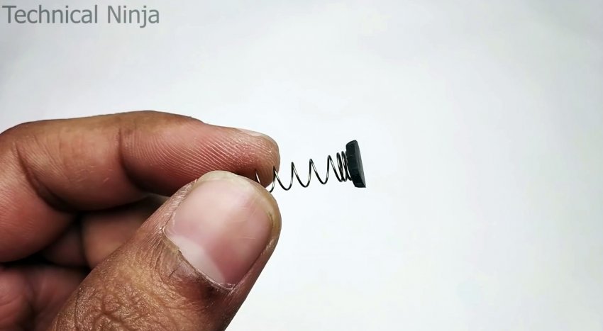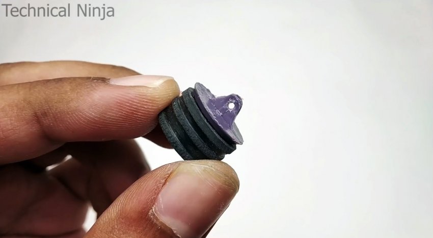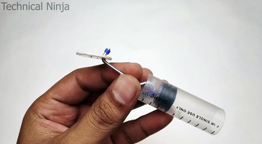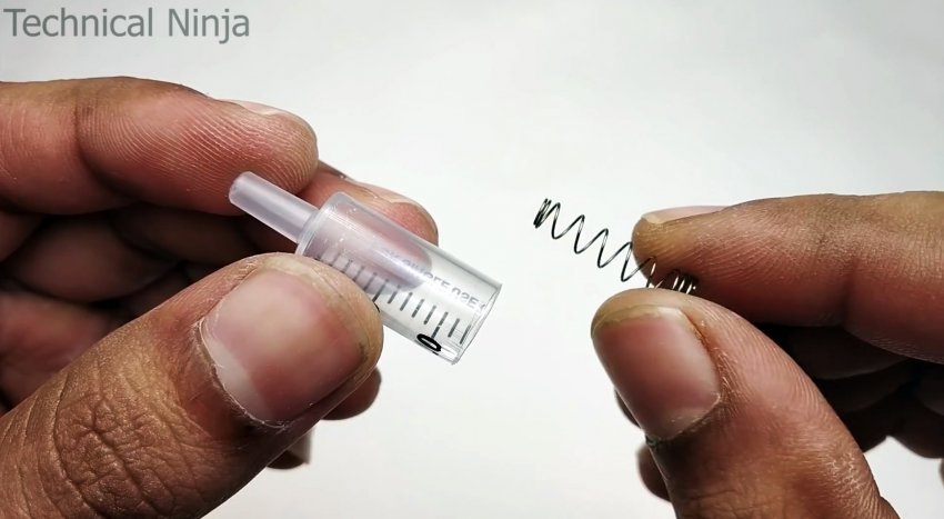 Далее отрезается половинка маленького шприца. В него помещается резиновая прокладка и пружинка с шариковой ручки. Затем он приклеивается на второе отверстие заглушки.
