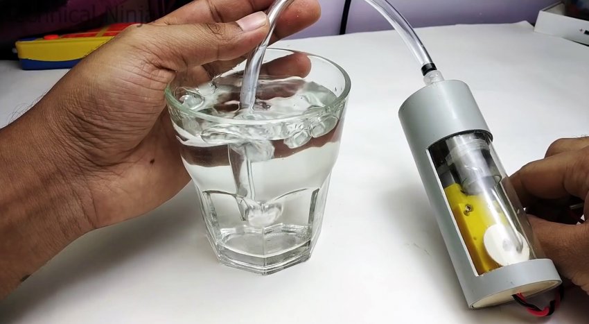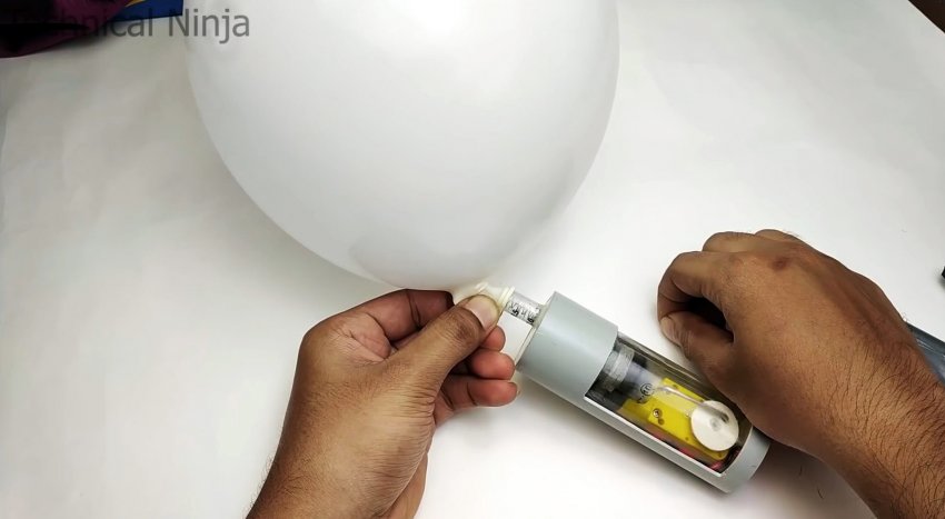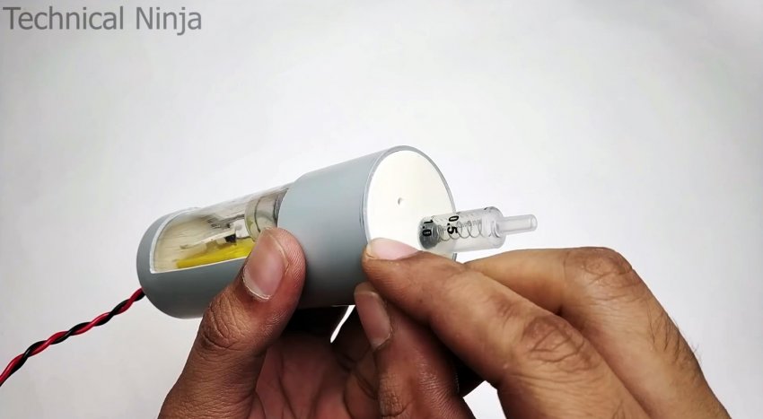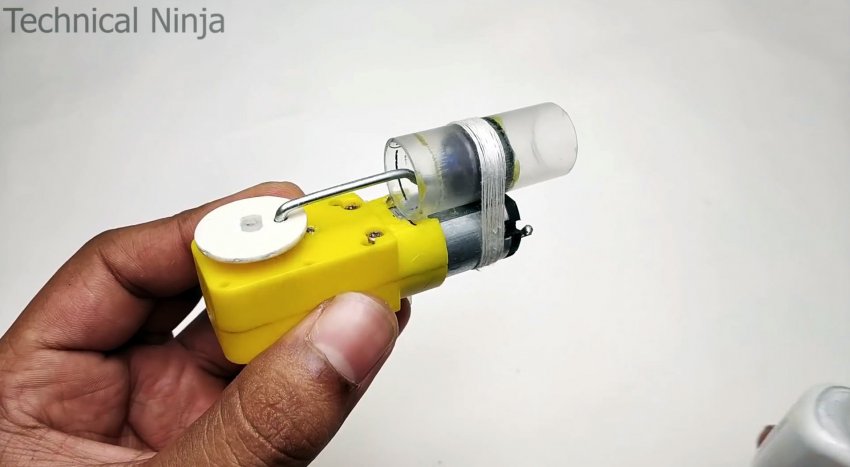 Теперь при подаче питания на двигатель, тот начнет качать воздух. Остается только натянуть на носик шприца шланг для удобства, и пользоваться им по назначению.