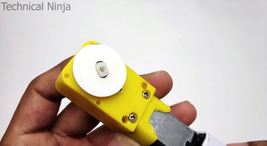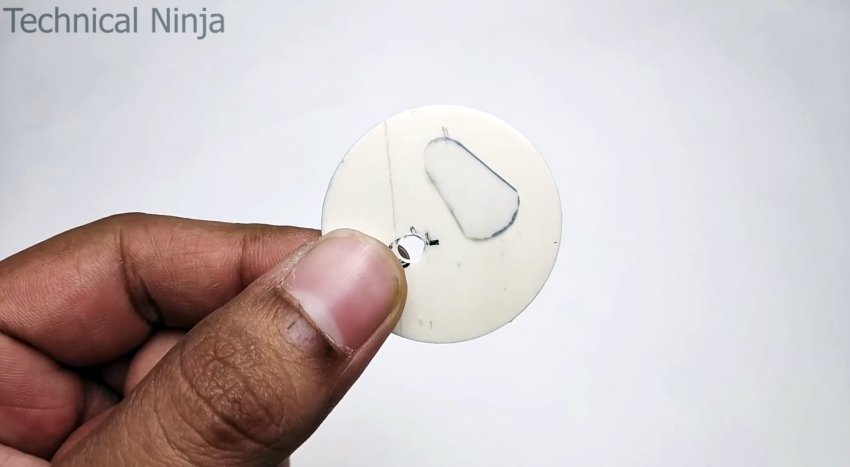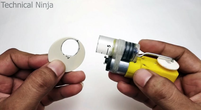 Из листового пластика вырезается диск с фигурным отверстием в центре. Его нужно установить на шпиндель редуктора. На диске ближе к краю сверлится такое же отверстие по диаметру, как на проушине поршня.