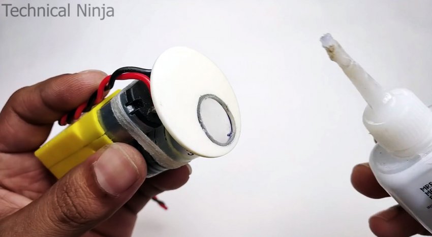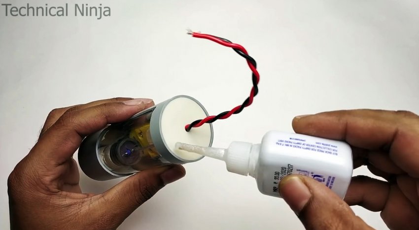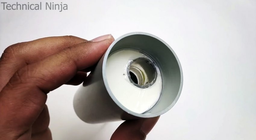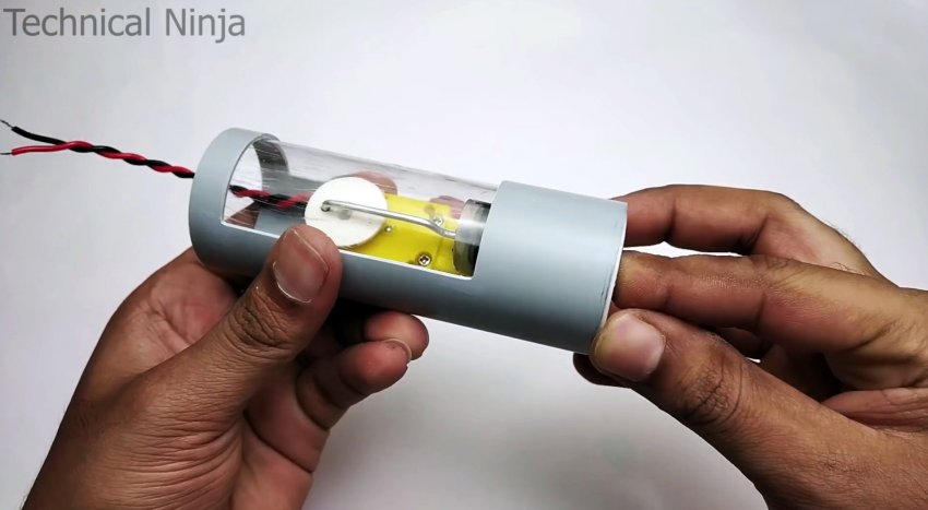 Из пластиковой канализационной трубы вырезается кожух компрессора. Затем из листового пластика нужно сделать для него заглушку. В последней вырезается отверстие под диаметр гильзы. К контактам моторчика припаиваются провода.