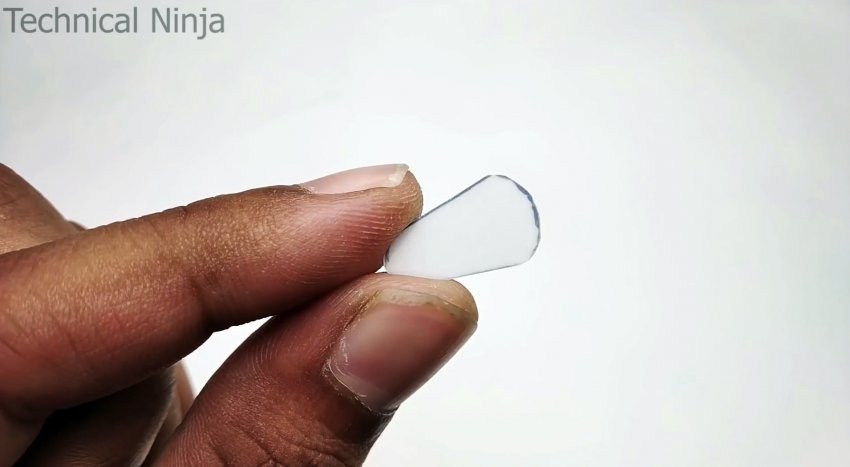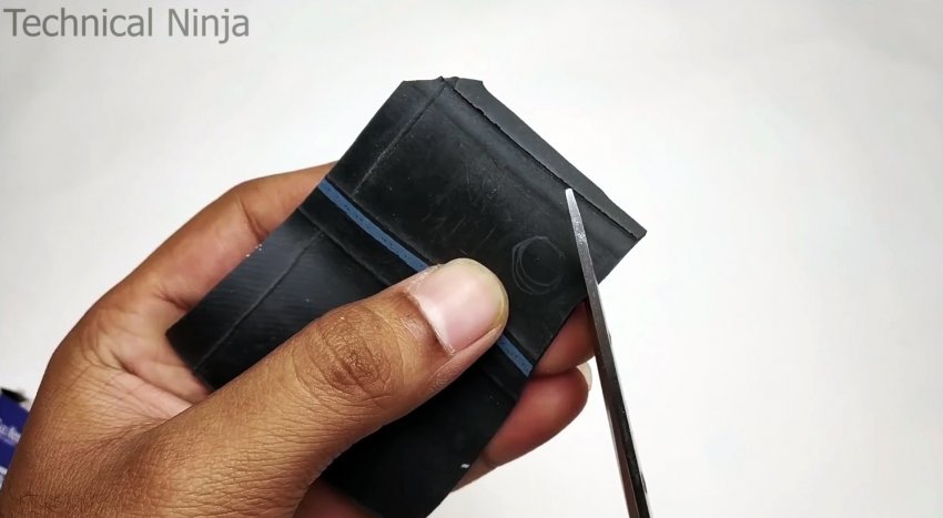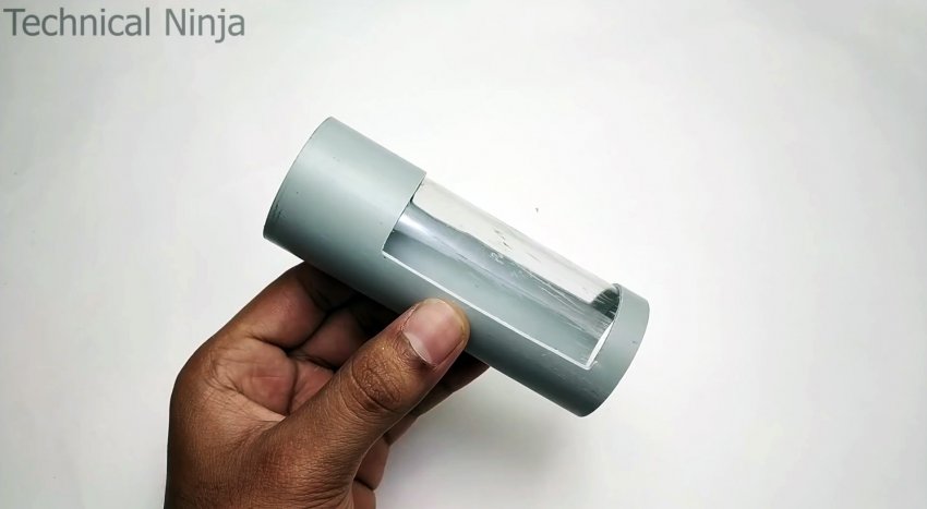 Теперь нужно прорезать смотровое окно в кожухе. Изнутри его необходимо заклеить прозрачным пластиком, срезанным из бутылочки от косметики или бытовой химии.