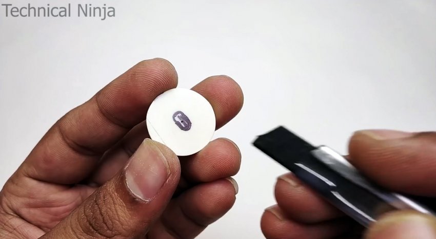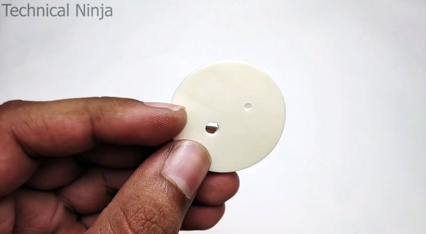 Далее вырезается еще одна заглушка. В ней проделывается 2 отверстия. На одно из них приклеивается лепесток из тонкой пленки. Он будет работать как клапан, впуская воздух и перекрывая его обратный выход.