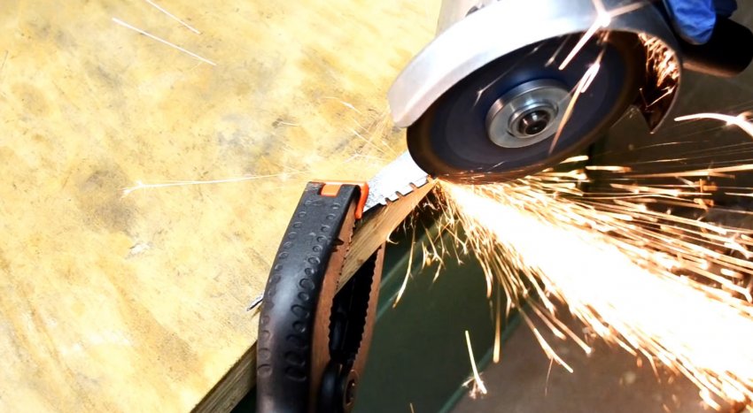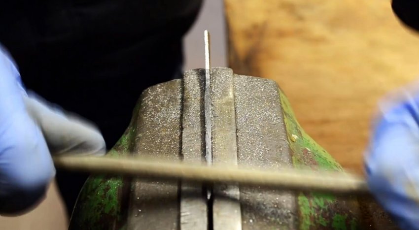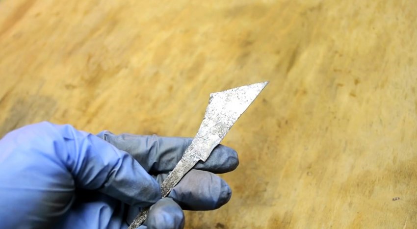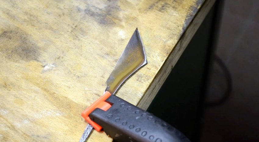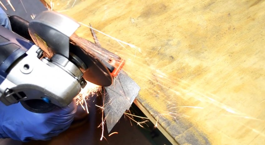 Клинок вырезается болгаркой, после этого нужно выровнять его края, чтобы они шли под прямым углом относительно боковых поверхностей. Делается это напильниками по металлу, а где ровные края, то и наждаком.