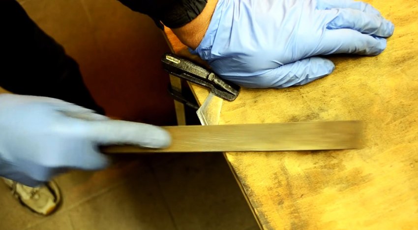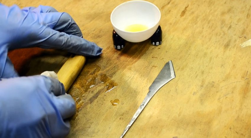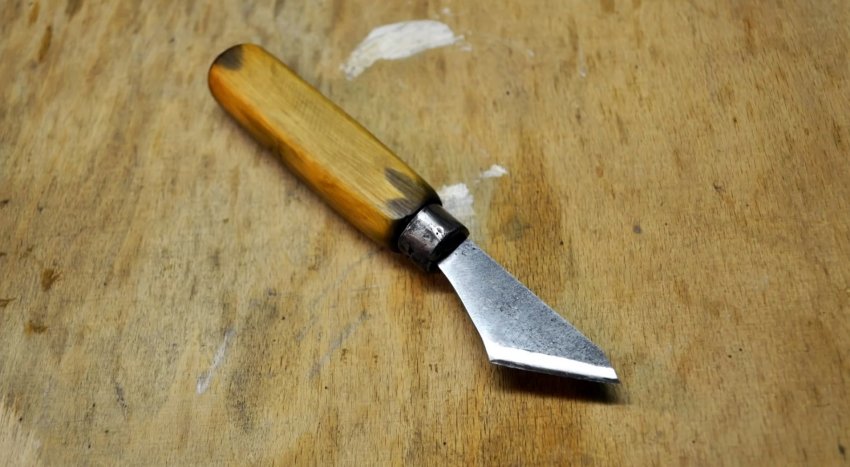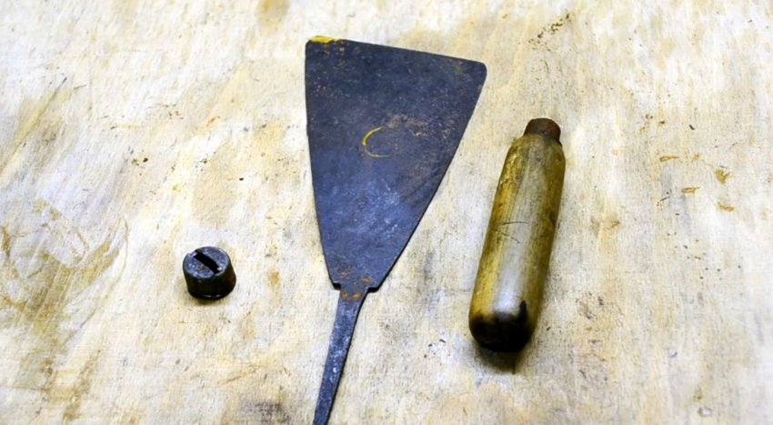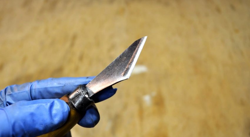 Далее требуется сделать новую или доработать штатную ручку от шпателя. Она делается прямой, но не цилиндрической, со сточенными в плоскость боковинами. Рукоять пропитывается маслом и набивается на хвостовик клинка.