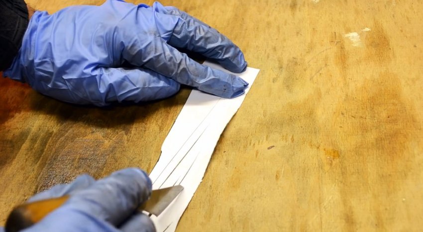 Затем из бумаги вырезается шаблон традиционного клинка ножа киридаши. Он прикладывается на шпатель и обводится.