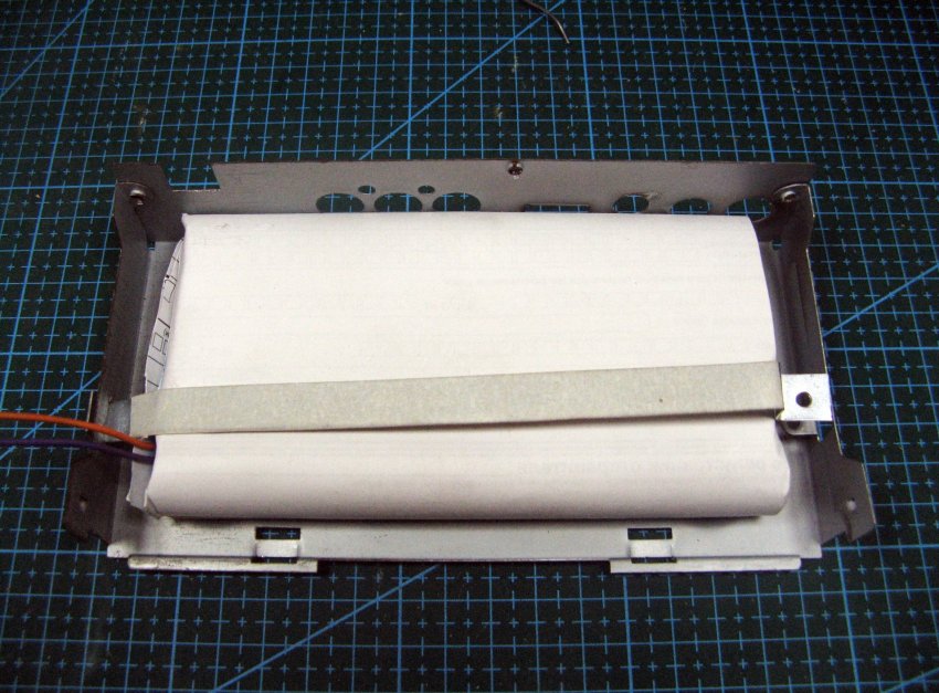 Аккумуляторы завернул в бумагу и вывел провода. Пару оборотов бумаги и получилась хорошая изоляция. Для фиксации я вырезал полоску металла и приклеил бумажный скотч в роли изоляции. Держится отлично.