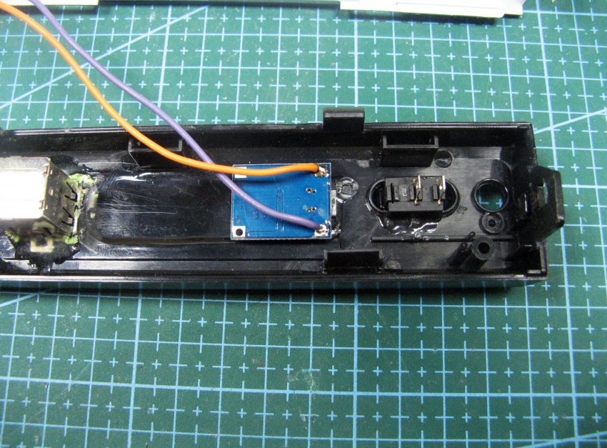 Заряжать решил через разъем принтера. Благо я разобрал их в количестве. Установил разъем на отверстие, где раньше стоял сетевой провод. Расширив слегка отверстие, стал отлично.