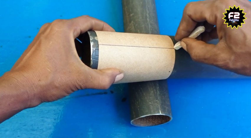 На его середине предварительно делается отметка. Оборачиваем бумагой трубу и делаем мелом метки на трубе в середине и месте соединения концов с обеих сторон листа, через полученные метки проводим линию. В результате получатся две линии, расположенные точно на противоположных концах окружности трубы.
