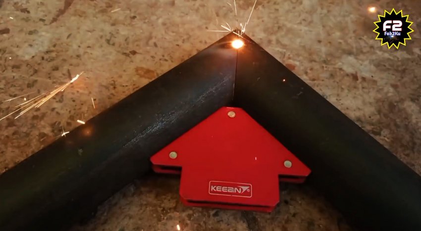 Магнит после этого шага можно снять — он больше не требуется. Зафиксированные прихваточными швами трубы обвариваются по всей длине соединения. Осталось обработать шов после сварки — отбить шлак и зачистить при помощи УШМ. Шов проверяется на герметичность, а полученный угол конструкции — на геометрическое соответствие с помощью угольника.