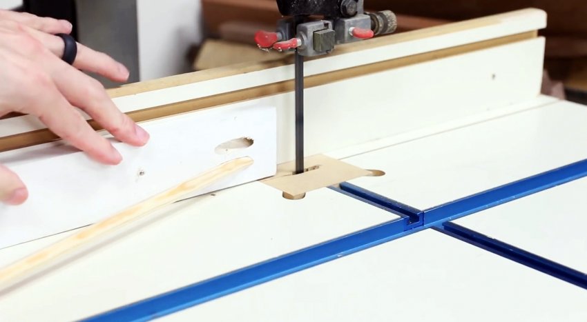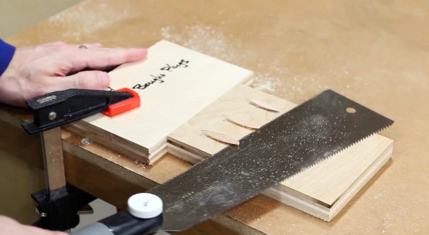 Берём брусок, делаем в нем косое глухое отверстие, засовываем в него круглую рейку и обрезаем ленточной пилой. В результате получаем самодельный дешёвый аналог покупных заглушек!