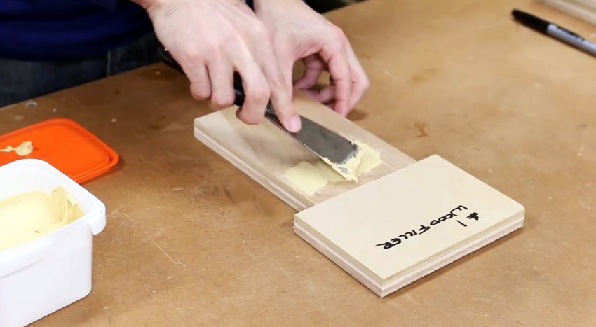 Заполняем отверстия шпаклёвкой, оставляем затвердеть, потом шлифуем - результат радует, он идеален! Если потом покрасить заготовку, то шпаклёвки не будет видно, единственная проблема – шпаклёвка не любит физического воздействия и может растрескаться со временем.