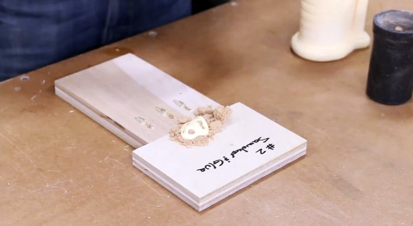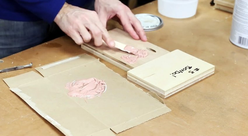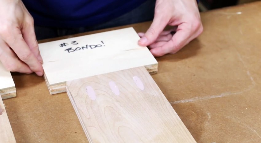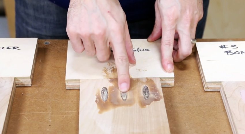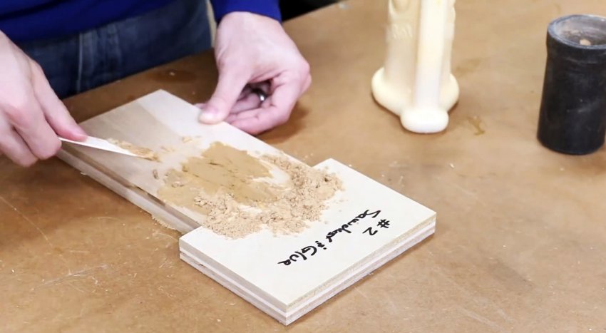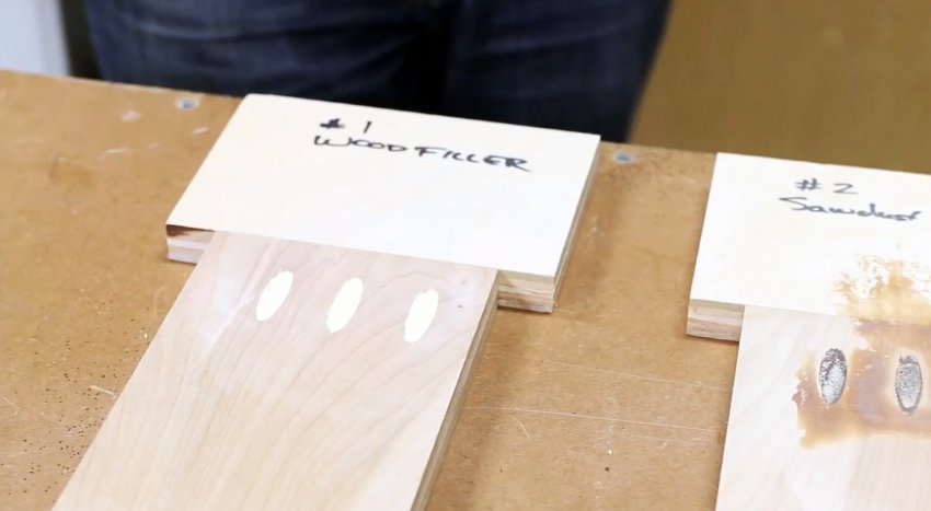 Делаем всё то же самое, что и в случае со шпаклёвкой по дереву, только заполняем отверстия клеем, смешанным с опилками.