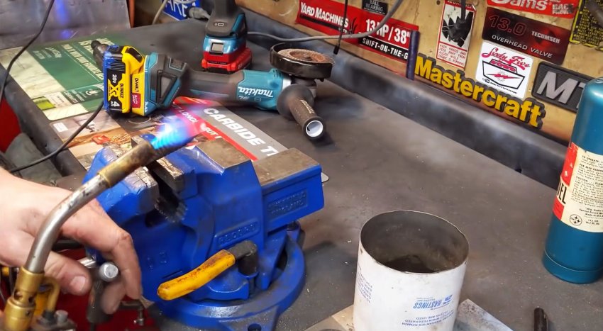 После того как вершины квадрата (торцевая часть детали) стали острыми «шпилями», необходимо будет закрепить горизонтально деталь в тисках, и закалить - деталь, используя обычную пропановую горелку, с помощью которой квадратная часть изделия нагревается до покраснения, и затем остужается водой.