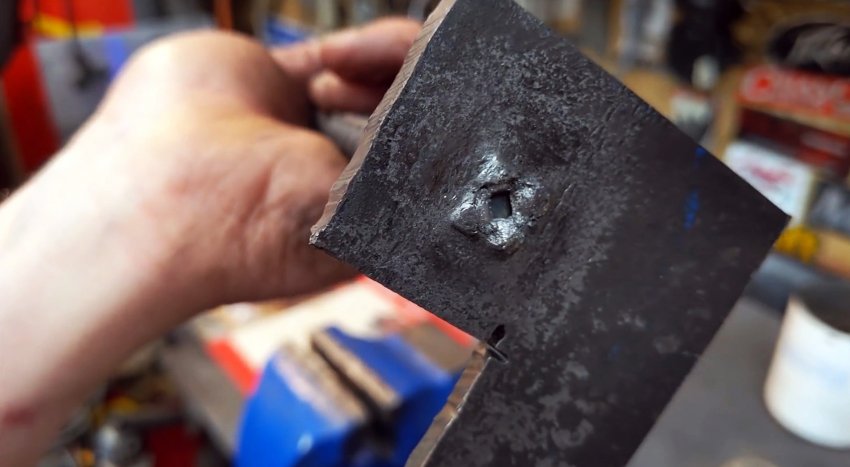 Удары молотком осуществляются по центру арматурного прутка и со средней силой. Таким образом из круглого отверстия «выбивается квадрат», и «лишний» металл просто выдавливается по ударами пробойника.
