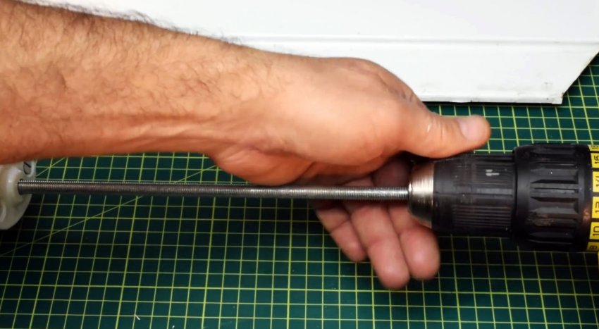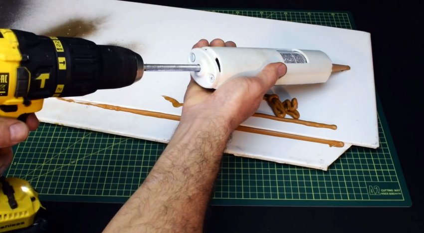 Теперь если зажать свободный край шпильки в патрон дрели, то при вращении она будет выталкивать герметик. Если шуруповерт или дрель имеют регулятор оборотов, то получится очень точно дозировать выход силикона, жидких гвоздей и т.д. С таким пистолетом работать намного проще и быстрее.