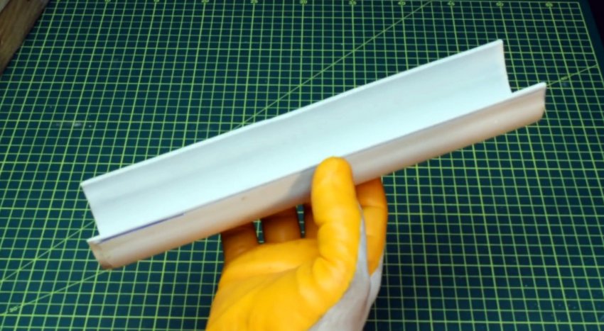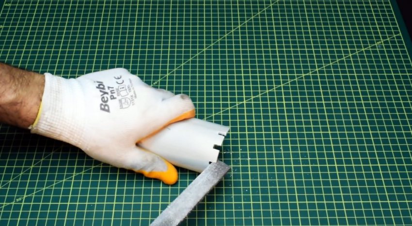С обратной стороны желоба делаются 3 зазубрины побольше, но не на всю оставшуюся лишнюю длину заготовки относительно герметика. Следует оставить зазор в 20 мм. Их необходимо выгнуть внутрь аналогичным образом.