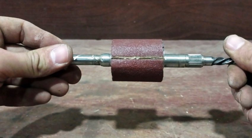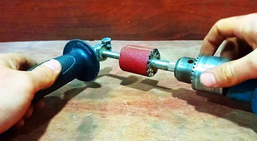 В гайку ввинчивается ручка от болгарки для надёжного и удобного удержания шлифовального приспособления. Противоположный конец вала зажимается в патрон дрели.