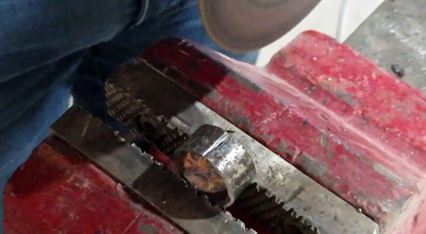 Заготовка зажимается в тиски, болгаркой по длине делается пропил.