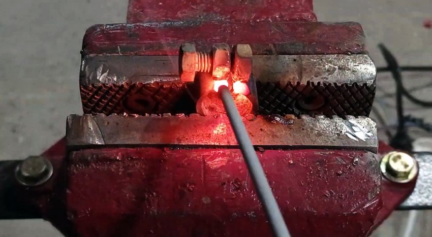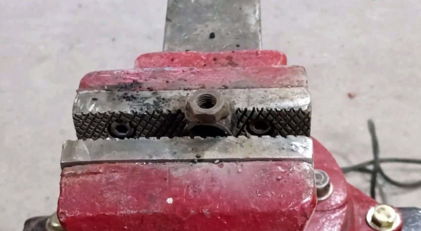 В гайках сверлом чуть больше диаметра их отверстия (6,5-7 или 8,5-9 мм) высверливается средина, чтобы свободно входил болт. К противоположной стороне приваривается вторая гайка для ручки.