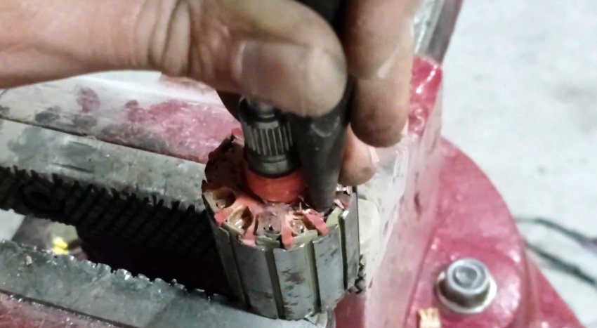 При помощи керна и молотка выбиваются провода обмоток, расположенные между якорными пластинами. С обратной стороны медь вытаскивается пассатижами.