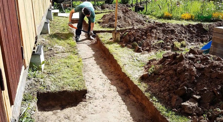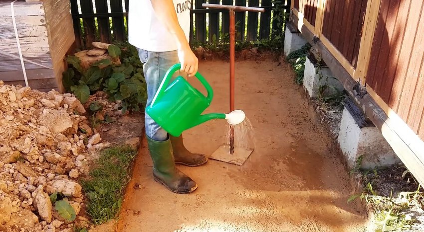 Вместо выбранного грунта в траншею засыпается песок. Его нужно утрамбовать. Поэтому лучше всего это делать послойно, насыпая за раз не более 10 см песка. Перед трамбовкой его следует обильно проливать водой из садовой лейки. Тогда он уплотнится лучше.