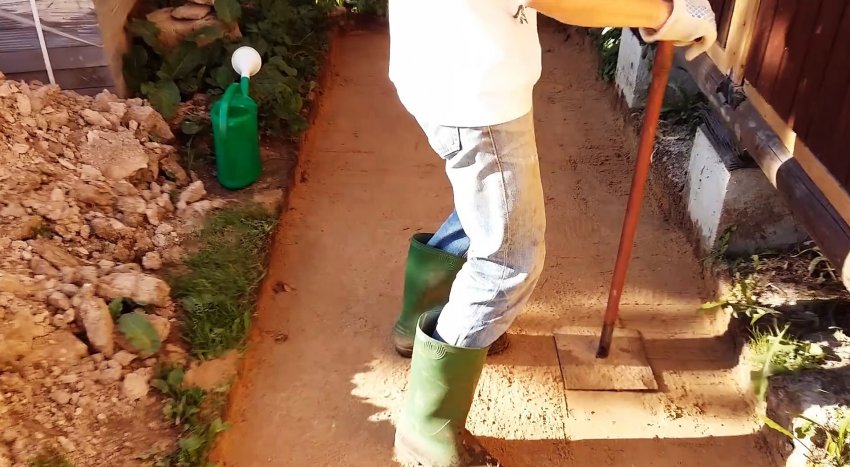 Слой за слоем набираем нужный уровень песчаный подложки. Перед каждым проходом трамбовкой следует подливать воду. В итоге плиты должны оказаться немного выше уровня грунта за шнуркой. Это исключит застой воды на дорожках.