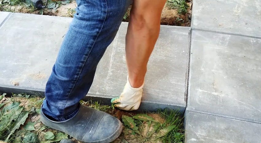 Такой подход позволяет выложить плитку со ступенькой всего в пару миллиметров. То есть дорожка получается вообще идеальной. В местах, где требуется подрезка плитки, выполняем ее болгаркой с алмазным диском. Обязательно нужно шлифовать фаску, чтобы край запила менее бросался в глаза.