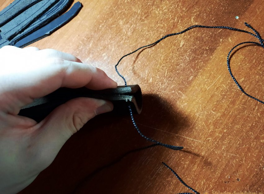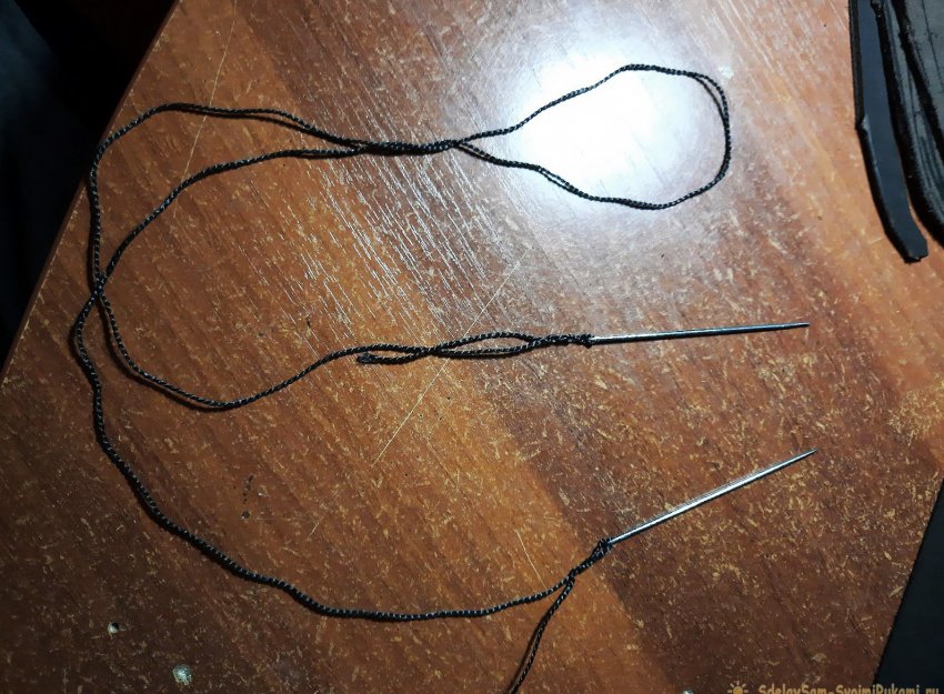 Ну а теперь пора ножны прошить. Прошивать будем по заранее проделанным отверстиям седельным швом. Для это нам понадобятся две иголки и прочная нить. Нить я отрезаю примерно в два-три раза больше чем длина шва.