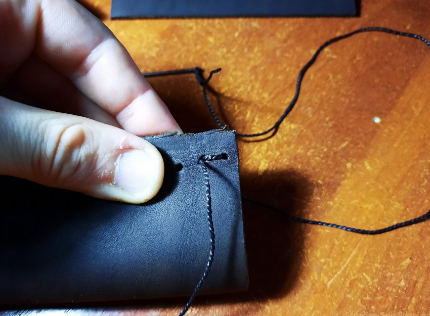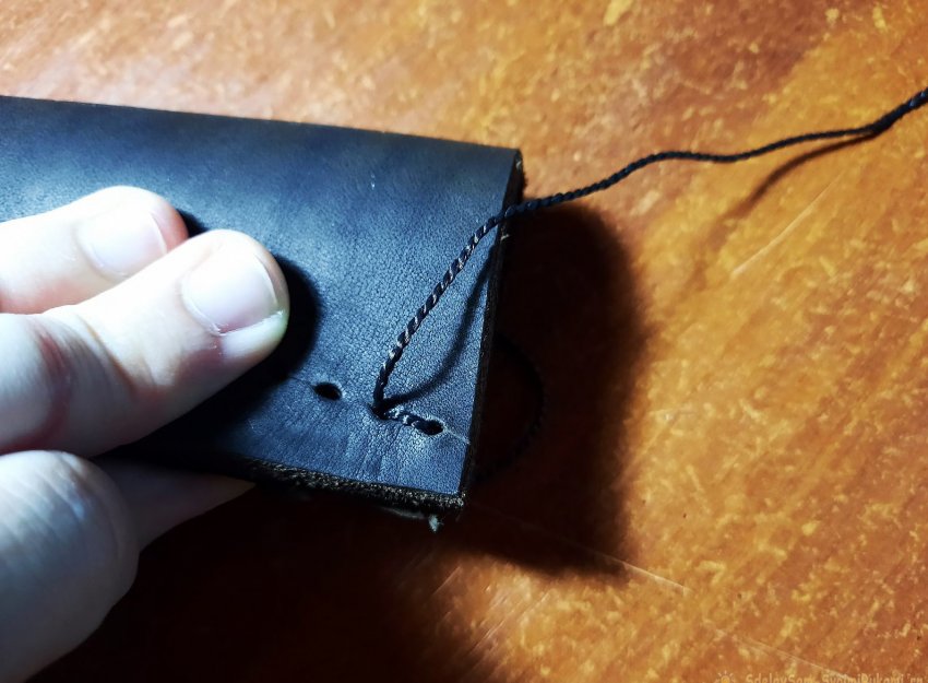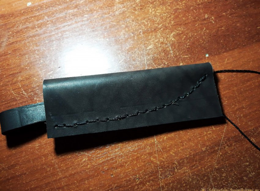 Таким образом прошиваем ножны по всей длине. В целом, если у вас найдется только одна большая иголка, то можно прошить ей сначала с одной стороны и потом с другой.