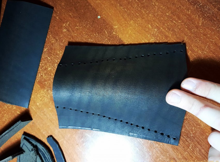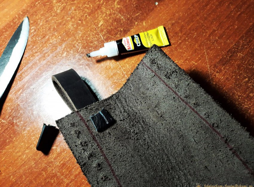 Далее я рекомендую добавить к ножнам ушко, через которое можно будет вешать ножны на ремень. Я этот шаг в первый раз пропустил, так вот приделывать ушко, когда уже ножны сшиты не очень-то удобно. Займемся этим сейчас.