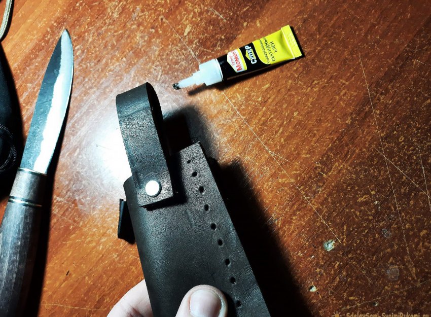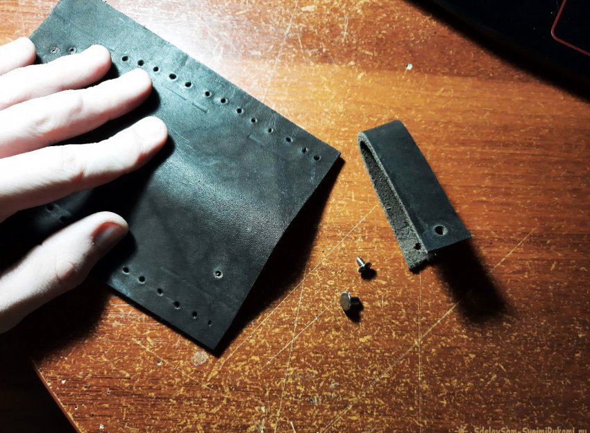Я вырезал полоску из кожи для ушка, сложил ее пополам и пробил отверстия под болтик в ножнах и в самом ушке. Болтик я снял со старого ремня, этот болтик скреплял ремень с пряжкой.