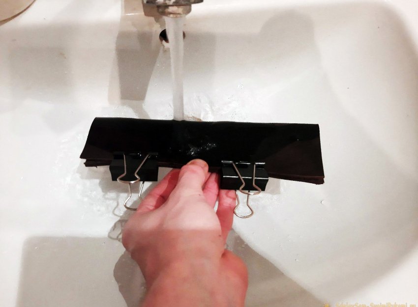 Ну и последний этап перед шитьем. Придадим форму нашим ножнам. Под горячей водой кожа станет мягкой, поэтому, я скрепил кожу пополам канцелярскими зажимами и помести под кран с горячей водой. Кожа высохнет и останется сложенной пополам уже и без прищепок.