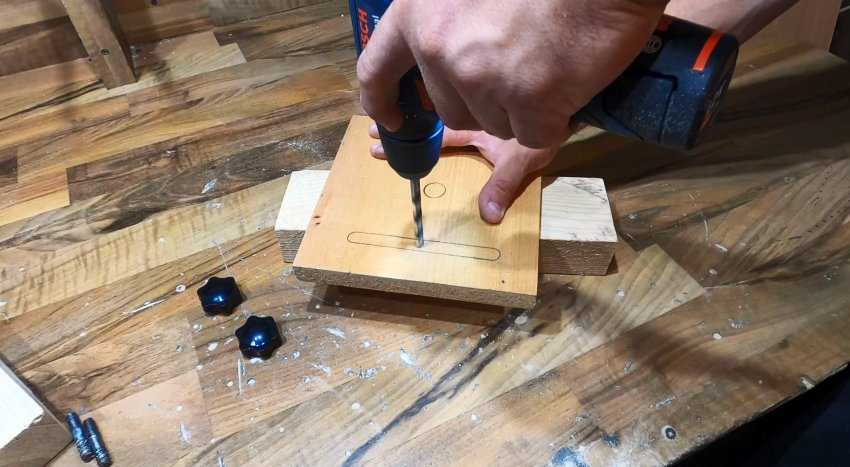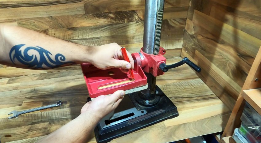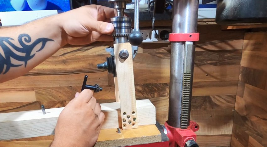 Далее следует заняться соединяющим узлом между станком и приставкой. Из ДСП или фанеры выпиливается заготовка по размеру сверлильного стола. Она размечается под отверстия в нем. Затем в заготовку врезаются мебельные шпильки.