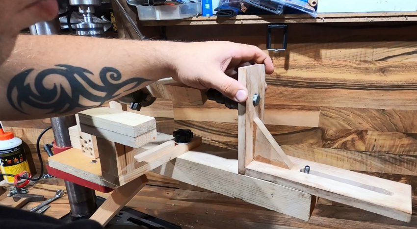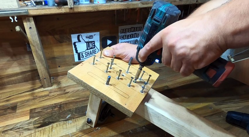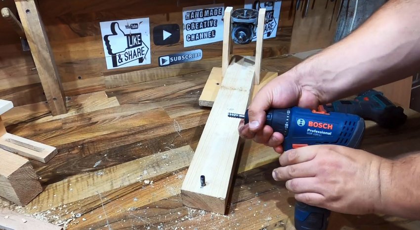 Сделанная деталь прикручивается к станине из бруска саморезами. Это очень важный узел, где не должно быть люфтов, поэтому крепежа лучше закрутить побольше.