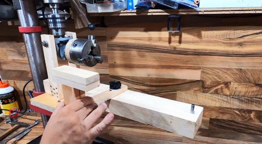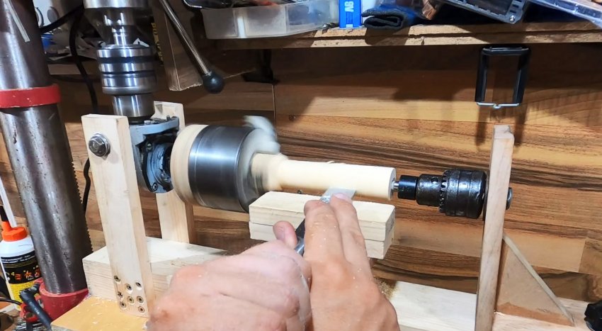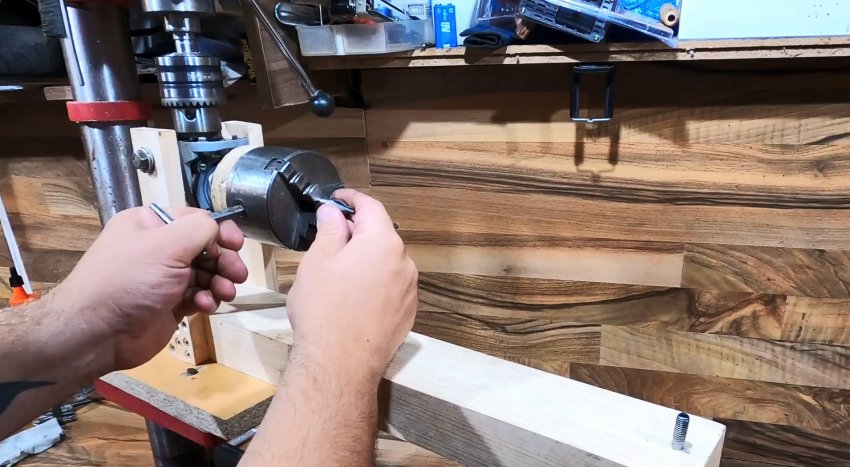 Благодаря редуктору болгарки, при запуске сверлильного станка будет вращаться токарный патрон с заготовкой. Это позволит ее точить. Если станок имеет регулятор оборотов, то будет вообще отлично.