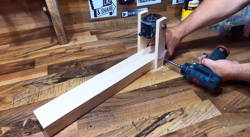 В качестве станины станка применяется брусок. Его ширина должна быть такой, как расстояние между стойками, закрепленными на редукторе. В противном случае в бруске придется делать пазы. Стойки прикручиваются к нему саморезами.
