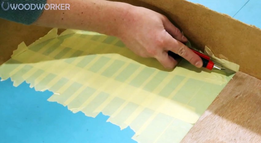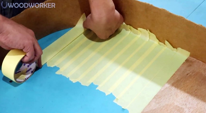 Сложную по форме деталь из листового материал можно вырезать по шаблону из малярного скотча. Для этого он полоса к полосе приклеивается по месту. Его излишки на перегибе срезаются. Затем поверхность из параллельных полос укрепляется несколькими перпендикулярными.