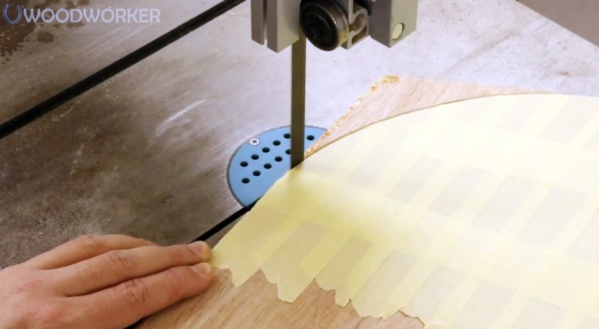 Теперь если сорвать скотч, то получим точно повторяющий необходимую форму шаблон. Остаться приклеить его на заготовку, и обрезать ее по нему.