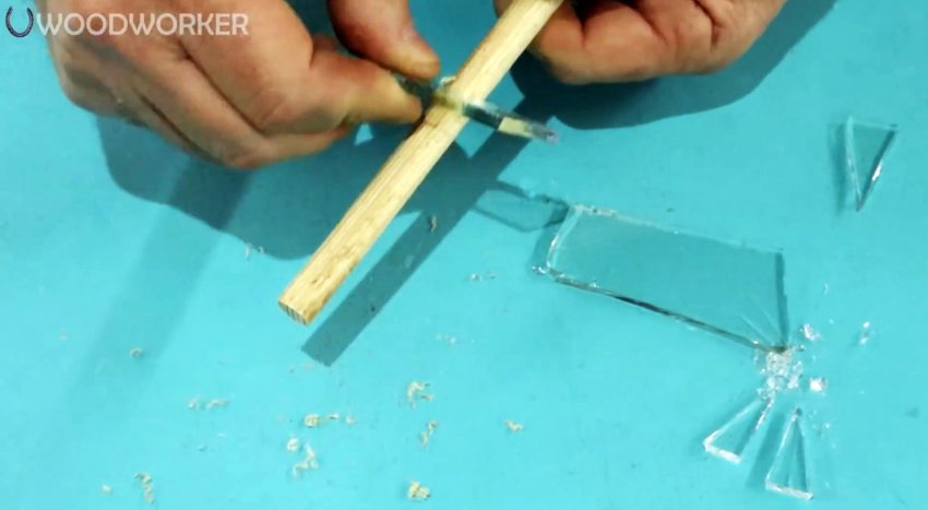 Чтобы быстро обработать деревянный черенок, сделав его гладким, поможет осколок стекла, имеющий форму полумесяца. Получить его можно, если ударить по стеклу бойком молотка. Такой осколок быстро соскабливает неровности.