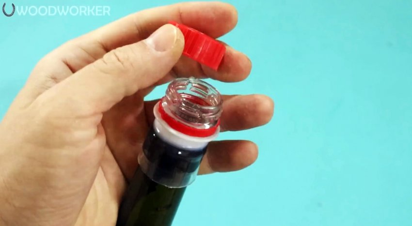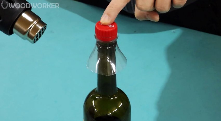 Чтобы остатки вина не испортились, стеклянную бутылку нужно герметично закрыть. Для этого наденьте сверху ее горлышка срезанную горловину из ПЭТ бутылки. Затем сделайте ее термоусадку феном.