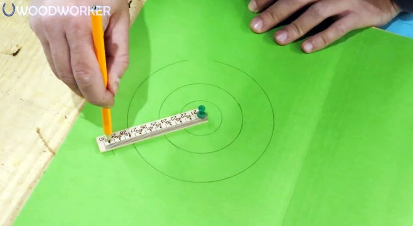 Чтобы чертить правильные круги, можно просверлить разметку линейки. Затем в отверстия вставляем иголку и карандаш, и рисуем круги нужного диаметра.