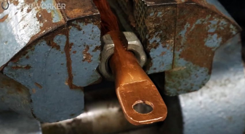 Кабельный наконечник при отсутствии клещей можно обдать половинками разрезанной гайки. Он помещается между ними, затем устанавливается в тиски. Теперь если зажать тиски, то наконечник надежно обожмется.